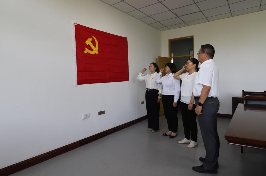 张爱萍同志向陈红梅、帅琴、原小梅3位同志表示热烈祝贺,并为她们佩戴了党徽。希望她们不仅从组织上入党,更要从思想上入党,在今后的工作、生活中,要继承和弘扬伟大建党精神,始终坚守理想,永葆初心,牢记党的宗旨,践行胡杨精神和兵团精神,在各自的岗位上履职尽责,不吃老本、再立新功。