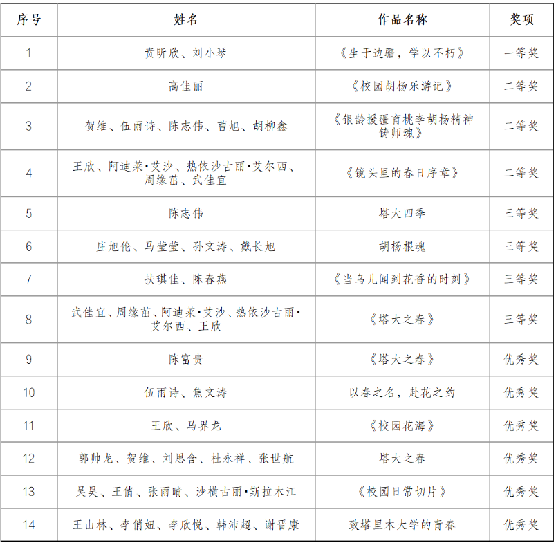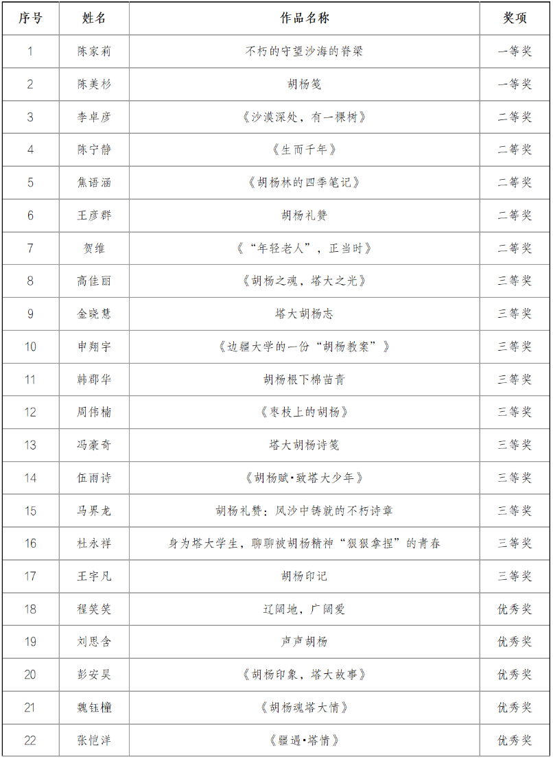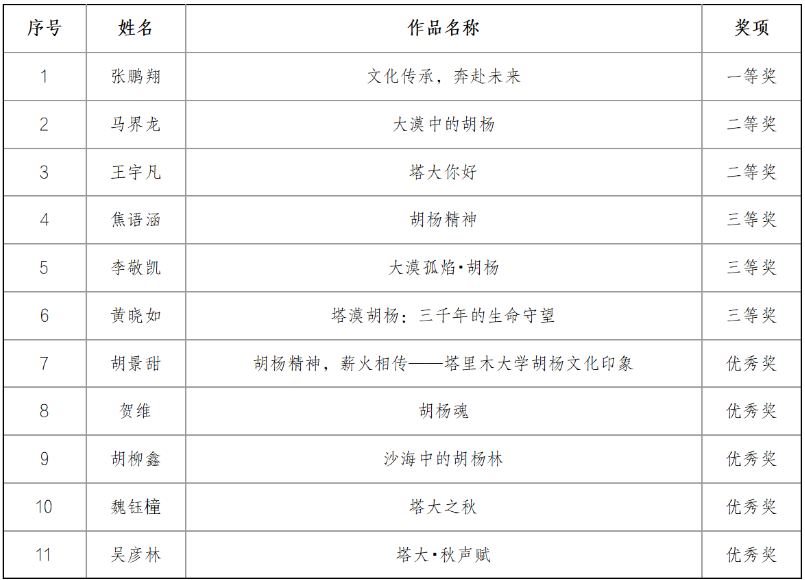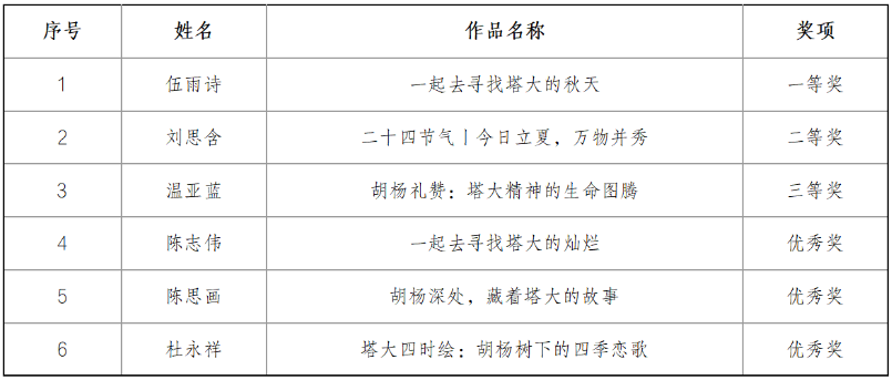 为进一步丰富塔里木大学胡杨文化内涵,更好地呈现学校历史、文化、精神和风物,促进校园文化建设,提升学生文化素养,我校面向全校师生征集塔里木大学第一届“胡杨印象”新媒体作品。经自愿报名、作品征集、资格审查、专家评审等环节,最终评选出一等奖、二等奖、三等奖及优秀奖若干。现将获奖名单予以公示: